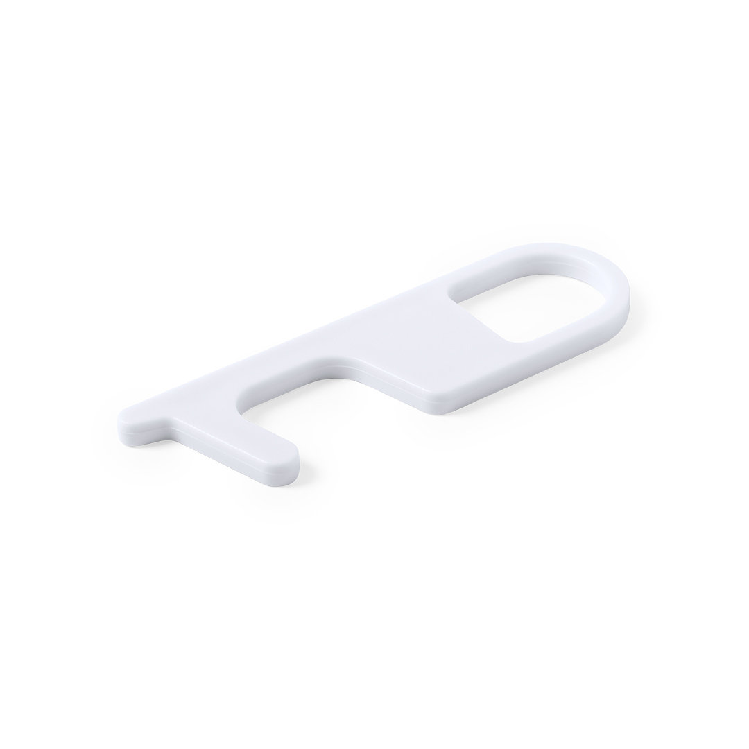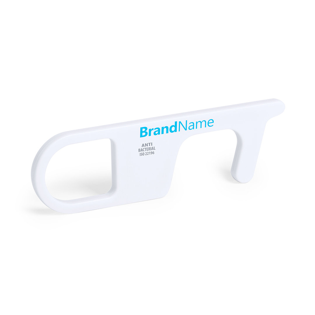 Llavero higiénico antibacteriano y anti-contacto, fabricado en resistente ABS de acabado sólido. Especialmente diseñado para evitar tocar con las manos superficies de uso común (picaportes de puertas, interruptores, grifos de uso público, cajeros automáticos...). Con cómodo troquel para el dedo. Recomendado para marcaje en tampografía.